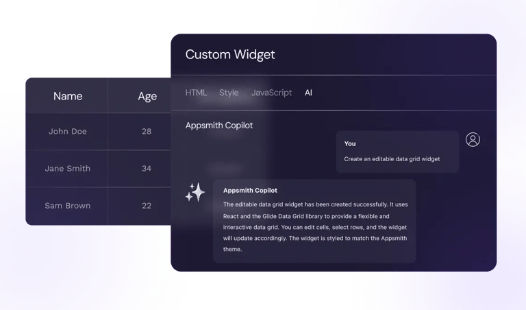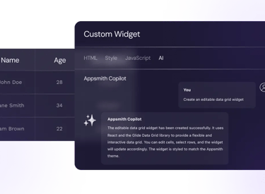Appsmith's OneChat allow you to create custom widgets and workflow logic in code. Start with natural language, and easily customize generated code for full control.